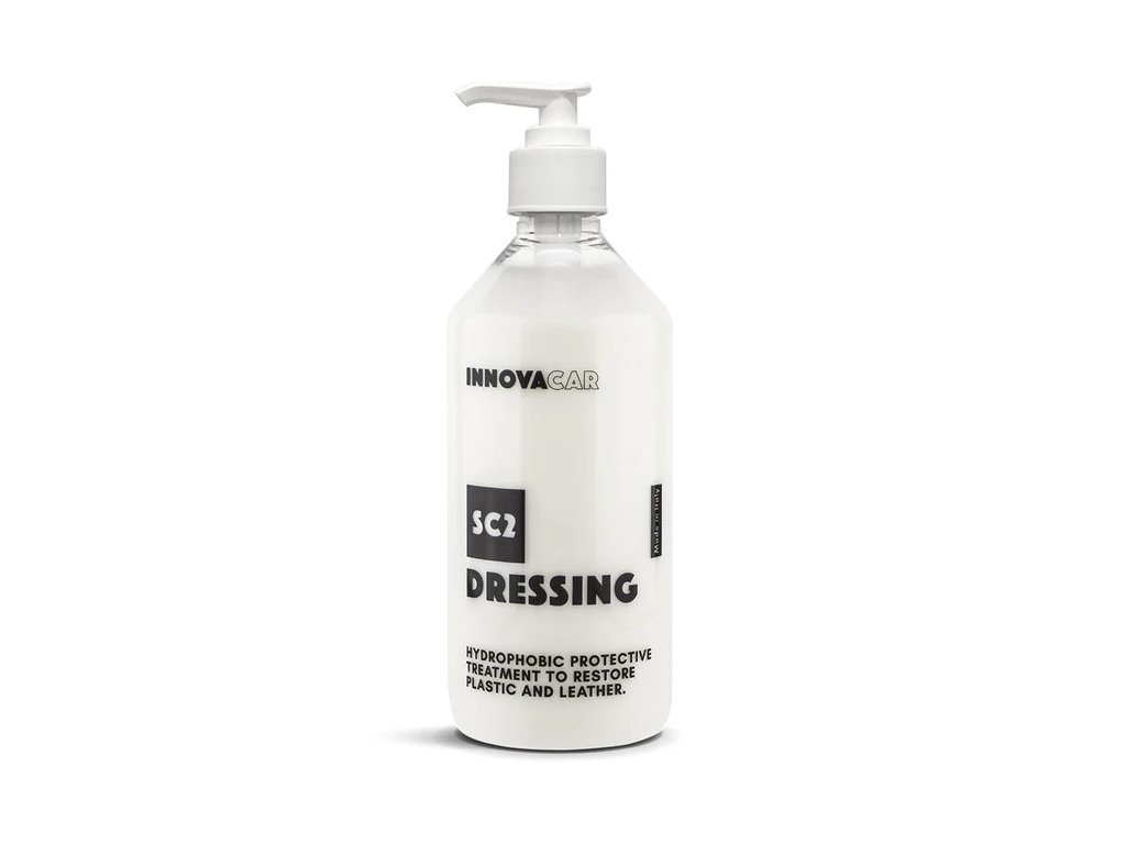 Popis přípravku: SC2 Dressing od Innovacar je nejvhodnější produkt pro ošetření, renovaci a regeneraci vnitřních a vnějších součástí automobilů, jako jsou plasty, vinyl, kůže, guma a akrylové materiály, které se časem a vlivem atmosférických podmínek opotřebovávají. Díky svému složení na vodní bázi nejnovější generace nabízí optimální řešení, které je vhodné pro všechny potřeby.
