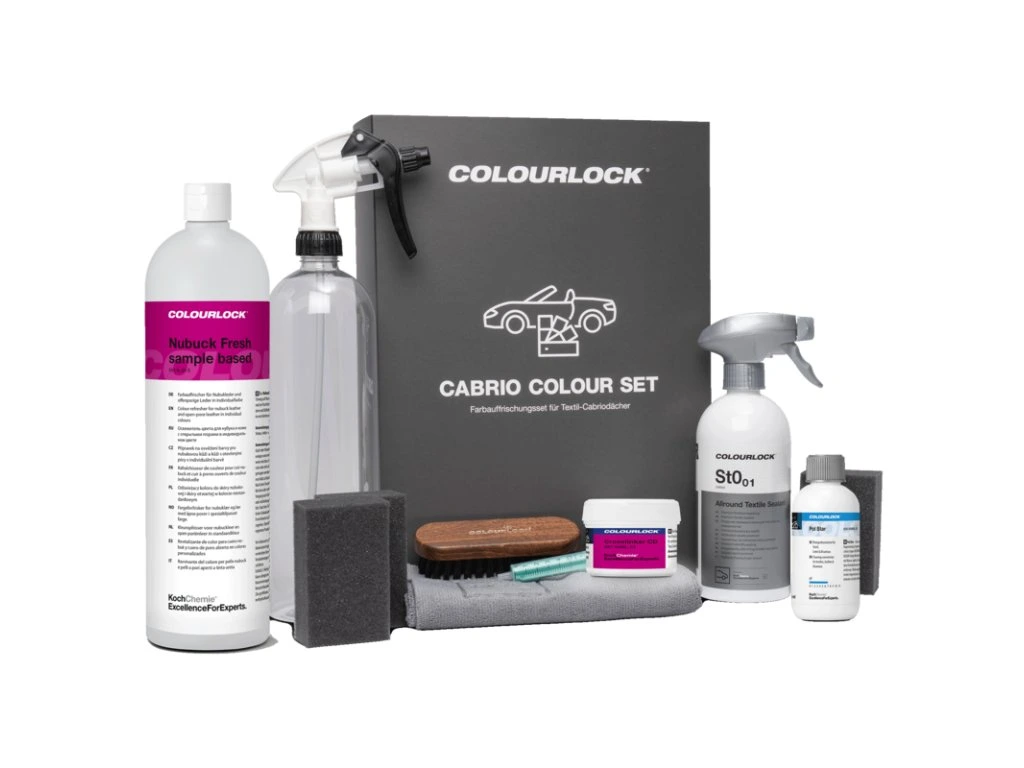 Popis přípravku: Sada Cabrio Colour pro textilní střechy kabrioletů nabízí profesionální řešení pro osvěžení a přebarvení vybledlých a zabarvených textilních střech kabrioletů. Sada obsahuje všechny potřebné produkty, včetně čističe měkké střechy, osvěžovače odpovídající barvy a finální textilní impregnace. To umožňuje efektivní a dlouhodobé obnovení původního vzhledu střechy kabrioletu.